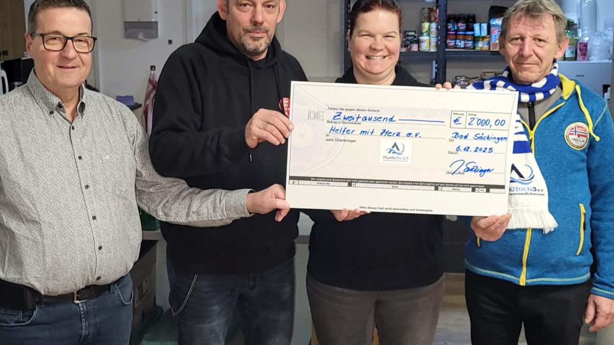 5. Dezember 20252000 Euro sammelten die Musiker und Musilerinnen des Orchsters Hochrhein3Ländereck. Das geld geht an den bad Säckinger Obdachlosenhilfeverein „Helfer mit Herz e.V.“